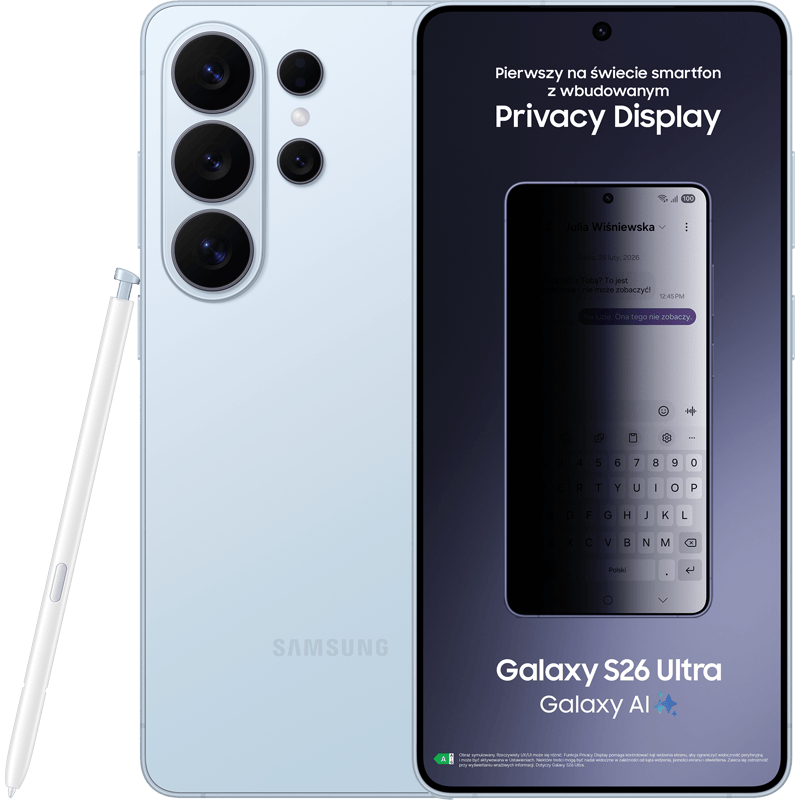 • Poznaj Samsung Galaxy S26 Ultra 5G – smartfon stworzony dla osób ceniących najwyższą jakość. Dzięki Dynamic AMOLED 2X o przekątnej 6,9 cala z rozdzielczością QHD+ obraz jest wyjątkowo wyraźny, a treści wyświetlane płynnie. Jasność szczytowa na poziomie 2600 nitów sprawia, że wszystko dobrze widać nawet w pełnym słońcu.